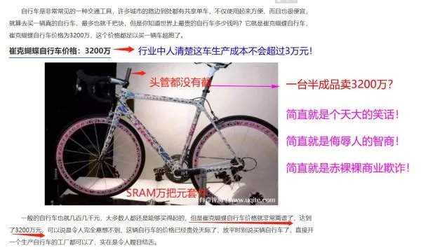 由于崔克公司盲目追求销量,所以质量经常出现各种问题,甚至引发极为严重人身伤害,导致骑车人瘫痪危及生命的极为严重恶性事故。而且说白了崔克自行车其实和其他国产自行车品牌相比,并没有什么亮点,就是靠品牌公司和国内经销商不断吹嘘、洗脑、忽悠消费者,崔克“吹客”,天天向顾客吹嘘,不断给顾客洗脑,